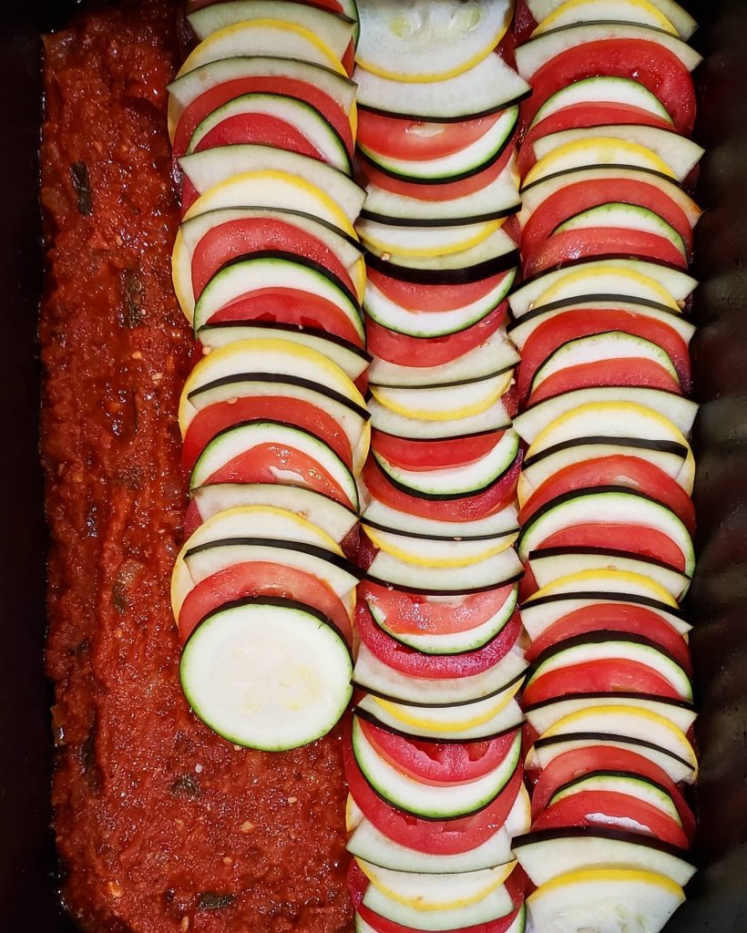 Thinly slice eggplant, tomatoes, yellow squash, and green zucchini. Layer on top of each other in neat rows.
